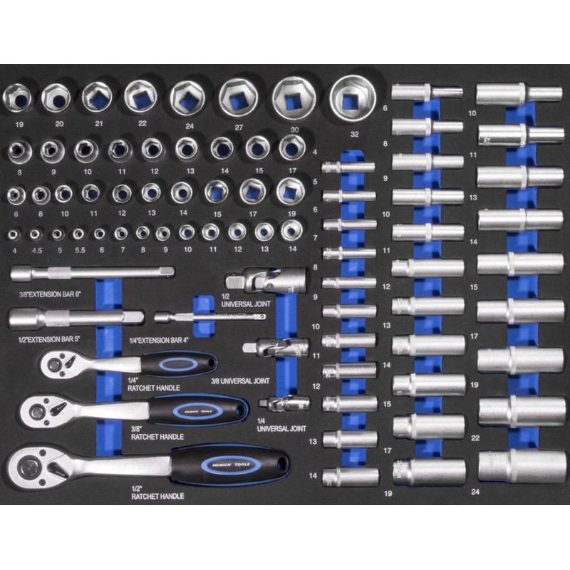 - 1 Stk. Umschaltknarre 1/2" 72 T- 17 Stk. Steckschlüsseleinsätze 1/2": 8,9,10,11,12,13,14,15,17,19,20,21,22,24,27,30,32 mm