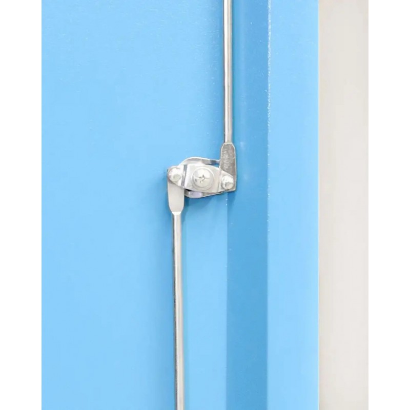 Die Sicherheit der gelagerten Gegenstände wird durch ein Zentralverriegelungssystem an zwei Türen sowie eine Zweipunktverriegelung gewährleistet. Der Schrank wird unmontiert geliefert, was Transport und Aufbau erleichtert.