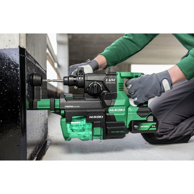 Zusätzliche Ausstattungsmerkmale wie die integrierte LED-Arbeitsleuchte, die praktische Auto-Stopp-Funktion für wiederholbare Bohrtiefen sowie der Sanftanlauf verbessern die Präzision und Kontrolle beim Arbeiten. Durch die Möglichkeit, eine Zyklon-Staubabsaugung mit HEPA-Filter anzuschließen, bleibt der Arbeitsplatz sauber und sicher. Der HiKOKI SDS-Plus Akku-Bohrhammer ist damit eine zuverlässige und leistungsstarke Lösung für professionelle Handwerker und anspruchsvolle Anwender.