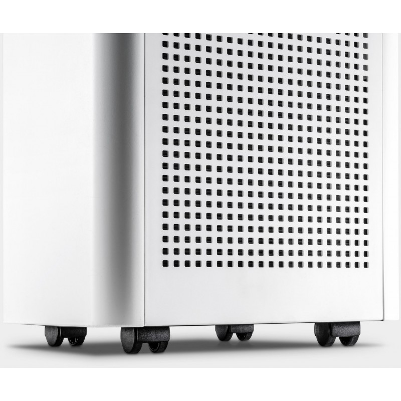 Anzeige von Temperatur, Luftfeuchtigkeit u. -qualität, Filter- u. Gerätestatus.4 drehbare Rollen