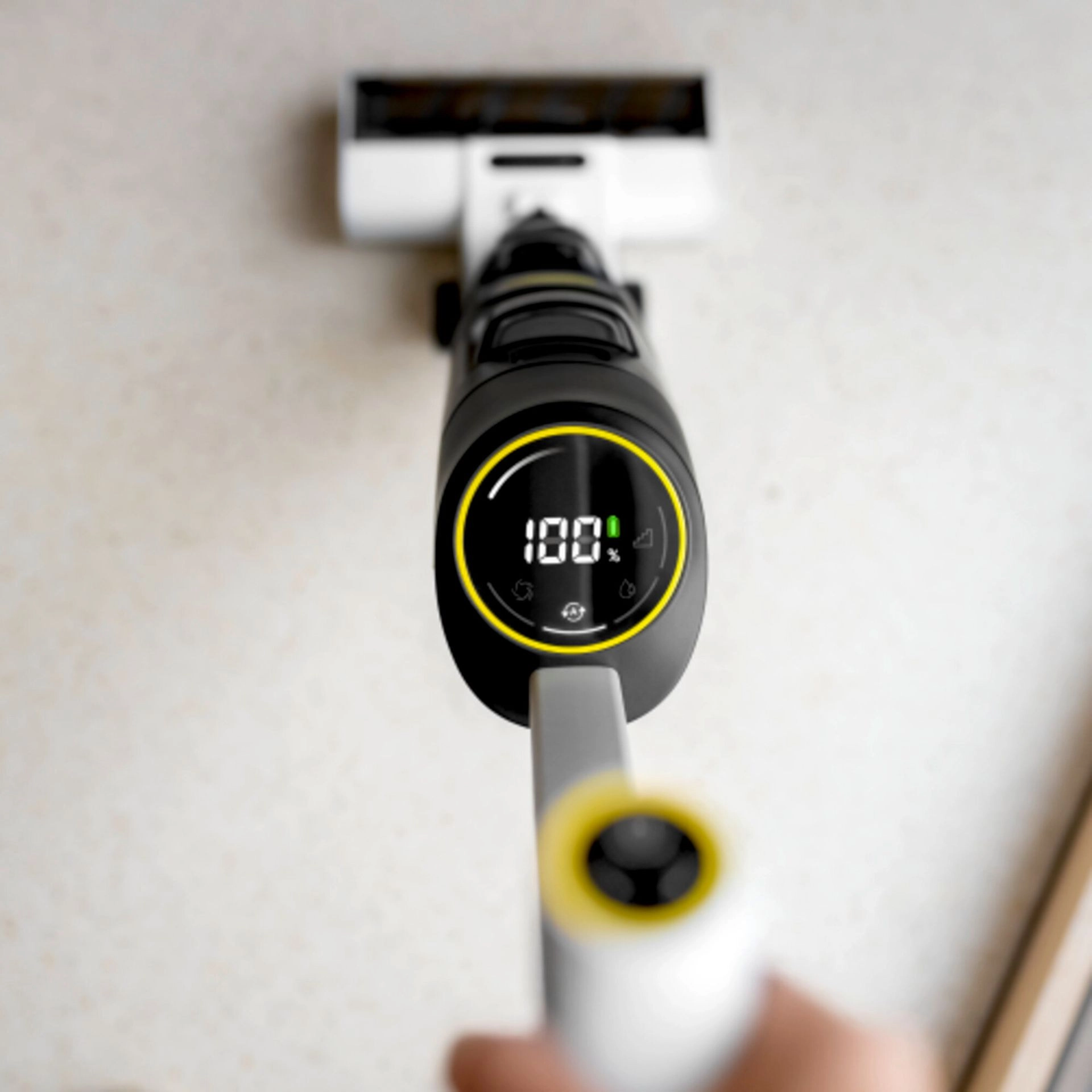 Das 3,2-Zoll-Display zeigt den gewählten Reinigungsmodus, Batteriestand und Wasserstände an. Die automatische Start/Stopp-Funktion erleichtert die Bedienung, und der Stair Assist Modus ermöglicht komfortables Reinigen von Treppen und engen Stellen ohne Gerätebewegung.