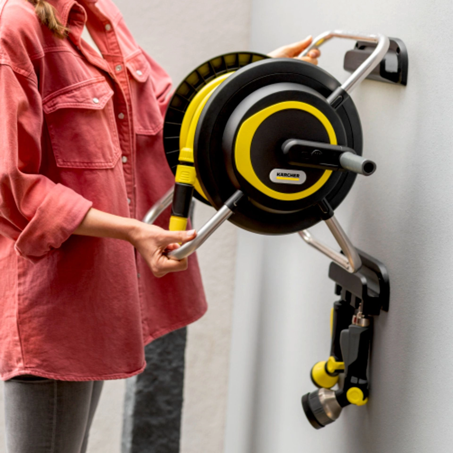 Düsen und Sprüher können bequem an der Wandhalterung aufgehängt werden, sodass alles griffbereit ist. Der HR 4 lässt sich leicht von der Halterung abnehmen und ist dank des ergonomischen Griffs einfach zu transportieren.