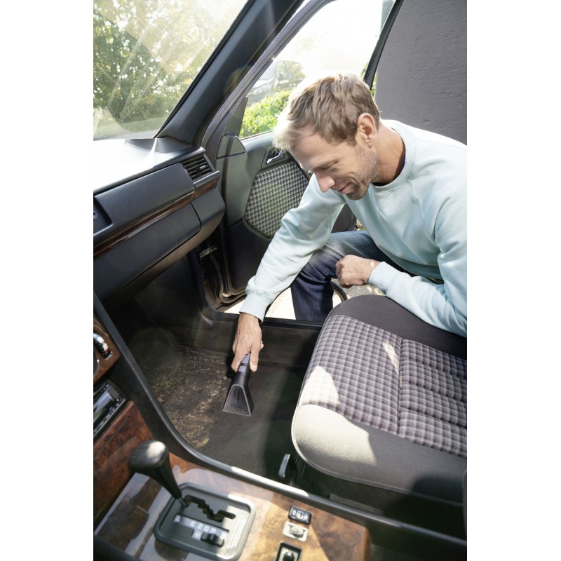 Gründliche Reinigung mit maximaler Bewegungsfreiheit: Der Staubsauger SE 3-18 Compact Battery Set reinigt textile Oberflächen gründlich und vor allem rückstandslos. Das kompakte Design macht das Gerät nicht nur praktisch, sondern dank des 18 V/2,5 Ah Kärcher Battery Power-Akkus auch dann einsetzbar, wenn keine Steckdose in der Nähe ist. So sparen Sie sich die aufwendige Reinigung des Fahrzeuginnenraums. Autositze, Teppiche und Kofferraum sowie Gartenmöbel und Polster werden im Handumdrehen von Schmutz befreit – genauso gründlich wie unsere kabelgebundenen Staubsauger. Der lange und flexible Saugschlauch mit integriertem Reinigungsmittelschlauch sorgt zudem für hohen Komfort und Flexibilität, selbst an schwer zugänglichen Stellen. Auch nach der Reinigung überzeugt der Staubsauger SE 3-18 mit seiner Spülfunktion, die Schmutz von Gerät und Schlauch entfernt und so der Bildung von Bakterien und Gerüchen vorbeugt.