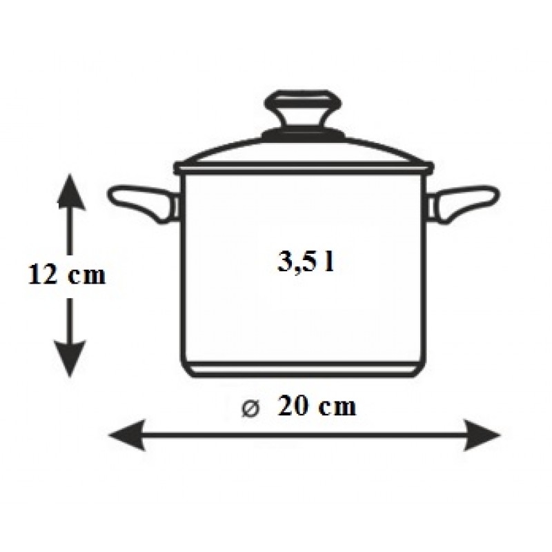 Der Kochtopf hat einen Durchmesser von 20 cm, sein Fassungsvermögen beträgt 3,5 l. Der Topf 20 cm ist Spülmaschinenfest.