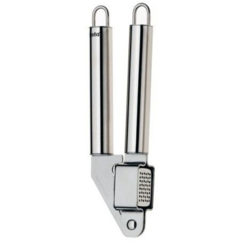 Küchenausstattung aus Edelstahl – Knoblauchpresse RONDOMit der Knoblauchpresse RONDO lässt sich der Knoblauch im Nu pressen. So sparen Sie sich das mühsame Knoblauch zerdrücken von Hand. Praktische Details: das Edelstahlsieb ist herausnehmbar und lässt sich so einfach reinigen sowie die Aufhängeösen am Griff.