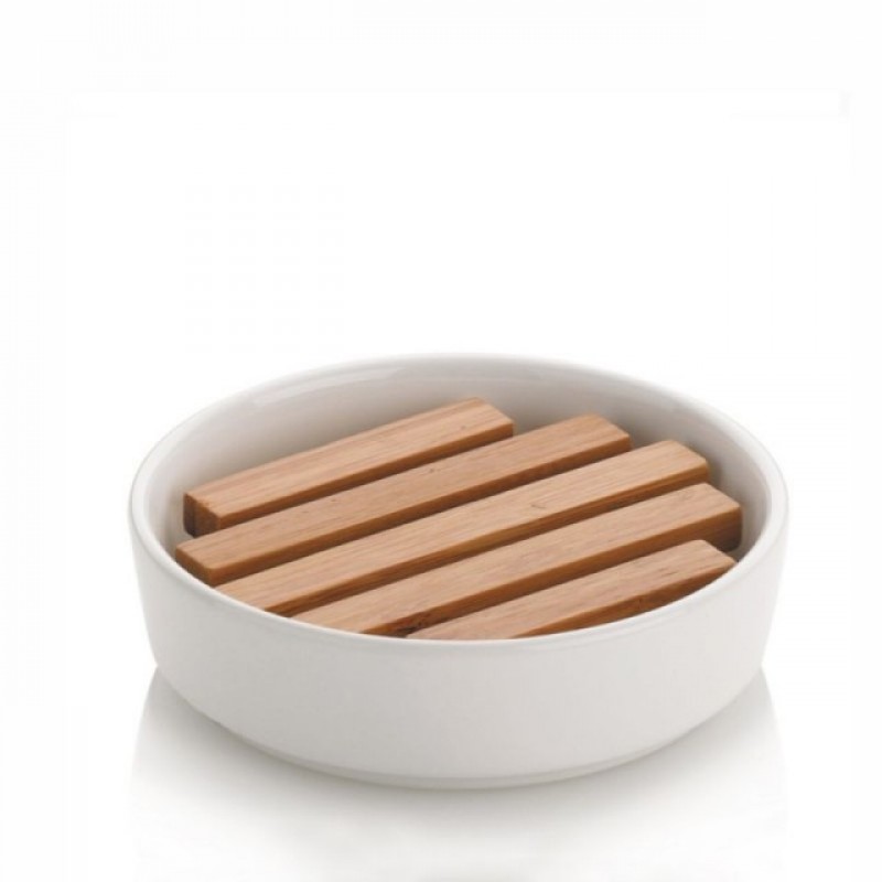 Zaubern Sie mit den wunderschönen Bad Accessoires aus weiß glänzendem Keramik und speziell darauf abgestimmtem Bambusholz ein natürliches Ambiente in Ihr Bad.Die runde Seifenschale aus Keramik hat innen eine genau angepasste, herausnehmbare Seifenablage, die aus mehreren kleinen Bambushölzern gefertigt ist.