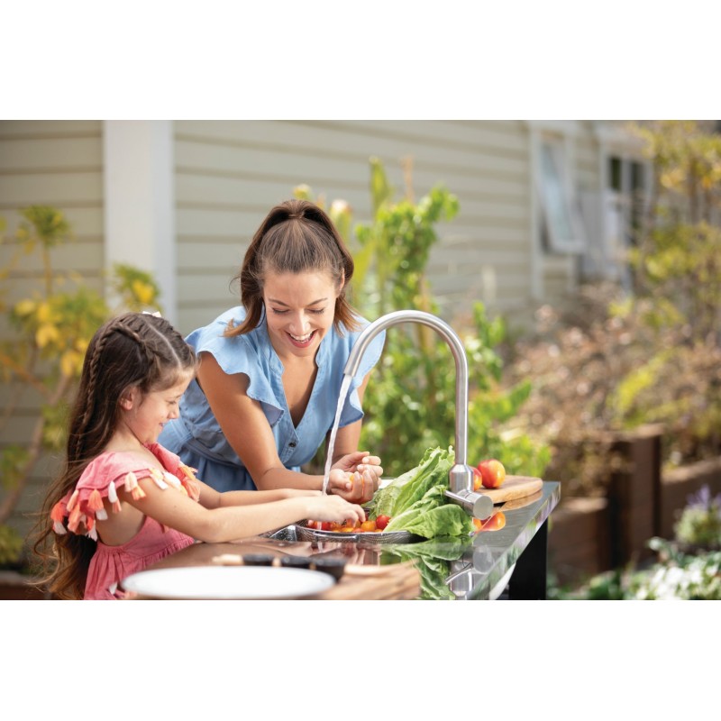 Die Outdoor-Küche UNITY CHEF der Marke Keter ist ideal für Grillabende mit der ganzen Familie. Die große, voll ausgestattete Außenküche bietet zahlreiche Arbeitsmöglichkeiten - Beistelltisch, Aufbewahrungsmöglichkeit und Küche in Einem: zum anrichten, vorbereiten und servieren von Speisen sowie den Abwasch danach. Die eingebaute Spüle ermöglicht einen Wasseranschluß, sie ist aus Edelstahl genau wie die Arbeitsplatte auf der Sie Ihre Plancha oder Ihren Grill aufstellen können. Die Struktur besteht aus Polypropylen in Holzoptik, was ihm eine sehr hohe Beständigkeit verleiht.