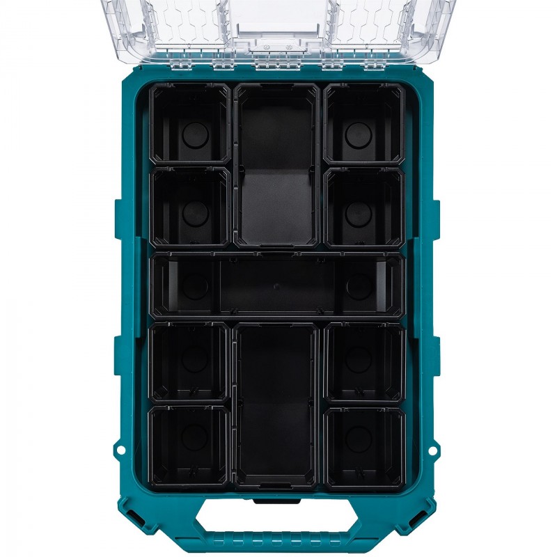 Der MAKTRAK Organizer flach M bietet 8,14 L Stauraum. Mit transparentem Rippendeckel, 11 modularen Bins sowie Unterteilern ideal für Kleinteile. Robust, stapelbar und perfekt für das Maktrak-System – optimal für Schrauben, Bits & Zubehör.