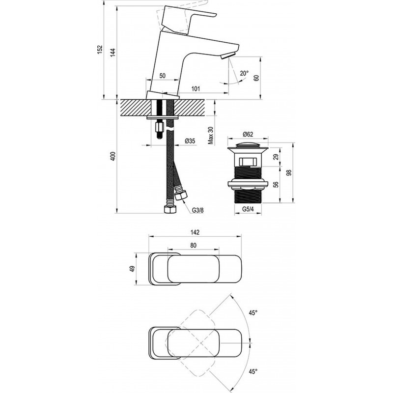 • Verbindungsschläuche: flexibel 450 mm, Durchmesser G3/8