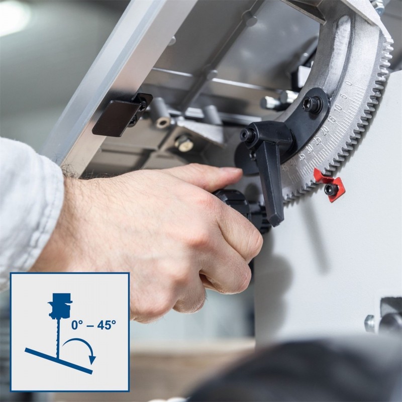 - Stufenlos neigbarer Sägetisch bis 45° – ideal für Gehrungsschnitte