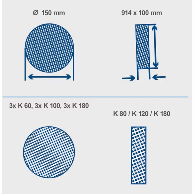 Dieses Set ist ideal, um die optimale Leistung der Schleifmaschine zu erhalten und ein gleichmäßiges, hochwertiges Materialabtragen zu gewährleisten.