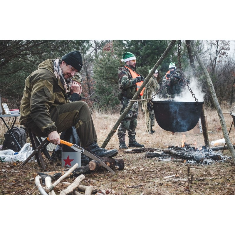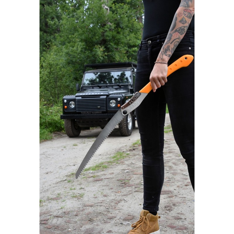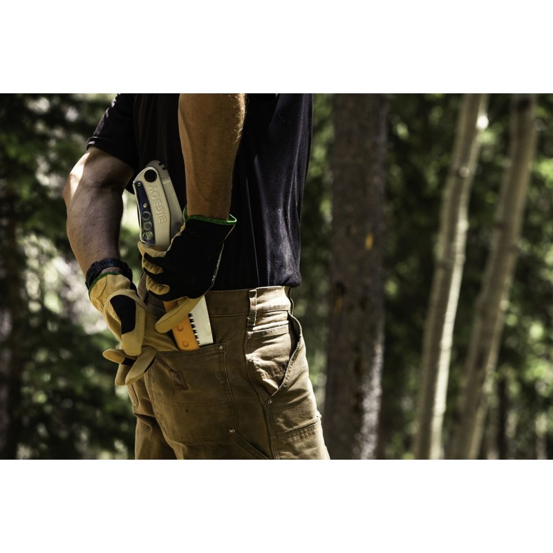 Die Biegung im Blatt sorgt dafür, dass die Zähne das Holz leicht greifen und die Säge nicht aus dem Sägeschnitt fällt. Dadurch sägen Sie reibungslos und kontrolliert sowohl frisches als auch trockenes Holz. Das starke, extra dicke Sägeblatt ist mit einer Kerbe von 1,7 mm vollständig „Outdoor-Proof“. Mit den großen, messerscharfen Zähnen sägen Sie im Handumdrehen auch durch dicke Baumstämme – ideal für alle, die große Lagerfeuer lieben.