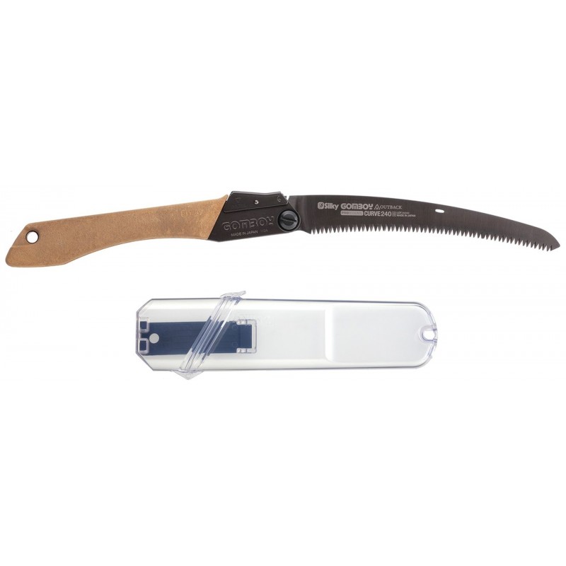 Der Griff aus Verbundmaterial besteht aus einer Holz-Kunststoff-Zusammensetzung, die eine warme und angenehme Haptik und hervorragende Kontrolle bietet. Das Gefühl in der Hand ist dabei etwas härter als bei den üblichen GOM-Gummigriffen von Silky, bietet dabei aber mehr Griffigkeit bei schmierigen Substanzen. Nehmen Sie diese Säge mit – egal wohin Sie gehen. Die Gomboy Curve Outback Edition ist kompakt, leicht und wird standardmäßig mit einem transparenten Hartschalenetui geliefert.