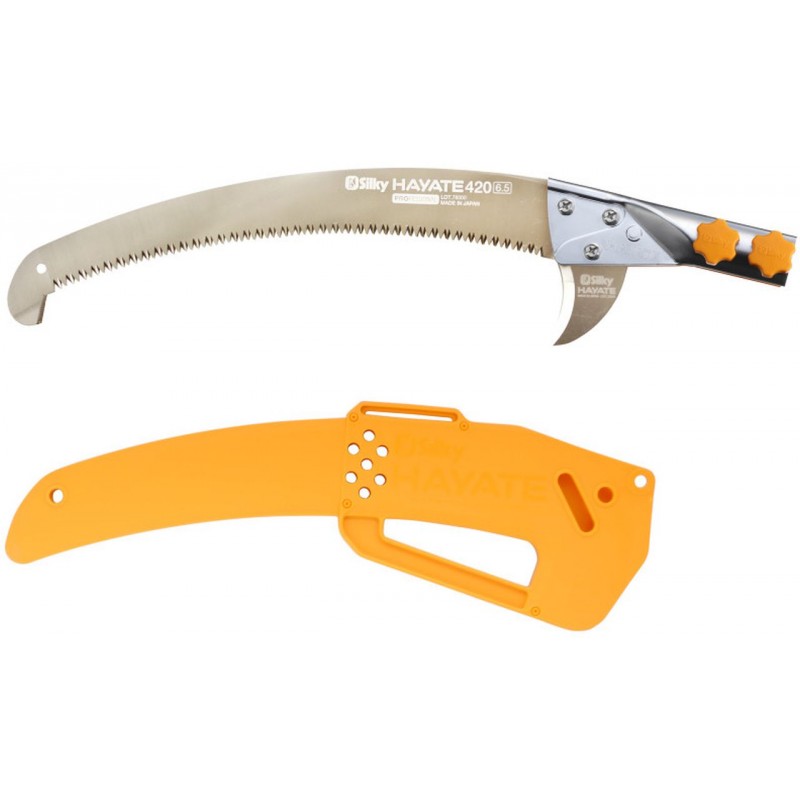 Die Hayate ist in vier Längen erhältlich: 3800, 5000, 6100 und 7700 mm. Die Säge wird mit einer maßgeschneiderten Plastikabdeckung geliefert. Die Zähne bleiben lange scharf und können bei Bedarf mit der Silky Feile nachgeschärft werden. Harz lässt sich effektiv mit Olivenöl entfernen. Lagern Sie die Säge stets trocken und prüfen Sie regelmäßig die Schrauben am Sägeblatt.