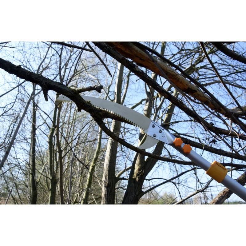 Die Aluminiumstange oval geformt ermöglicht eine präzise Kontrolle der Schnittführung, sorgt für hohe Steifigkeit und reduziert Biegung. Am Sägeblatt befinden sich zwei Sicheln: