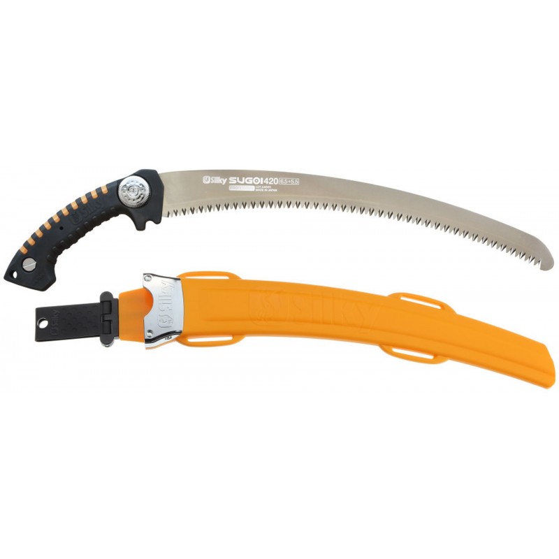 Die Sugoi eignet sich sowohl für das Schneiden von frischem Holz als auch für das Entfernen von toten Ästen. Das Modell ist in verschiedenen Blattlängen erhältlich (330, 360 und 420 mm). Die Zähne bleiben, wie bei allen Silky Sägen, lange scharf und können bei Bedarf mit der Silky Feile nachgeschärft werden.