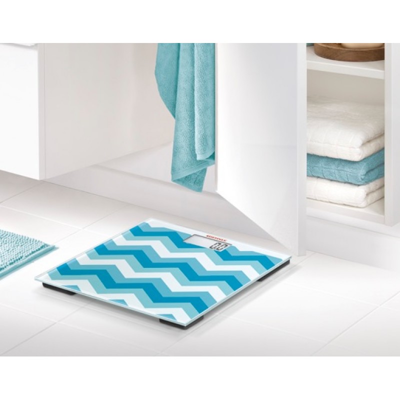 Die Glas-Personenwaage Jolly Digital Sky Blue mit modischem Zickzack-Muster in hellen, frischen Türkistönen setzt starke Akzente. Die Miniwaage mit Maxi-Leistung: Durch ihre kompakte und superflache Bauweise ist sie ideal für kleinere Badezimmer und auch als perfekter Begleiter auf Reisen.Hohe Tragkraft (180 kg), umschaltbar auf st / lb, 100-g-genaue Teilung