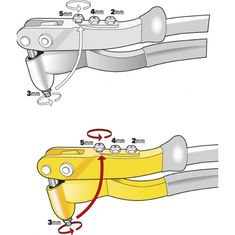 • Lieferung mit einem Schraubenschlüssel sowie je einem Nietkopf für Blindnieten von ø 2 mm, 3 mm, 4 mm und 5 mm