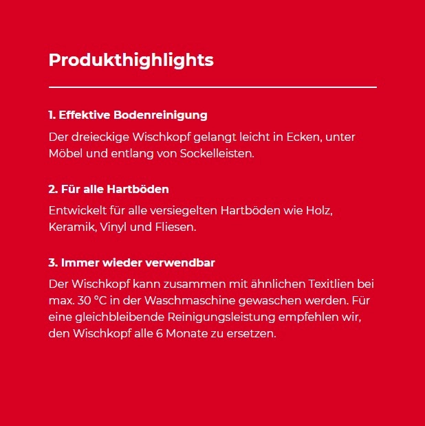 Der dreieckige Wischkopf gelangt mühelos in Ecken, unter Möbel und entlang von Sockelleisten und sorgt so immer für ein gründliches Reinigungsergebnis.