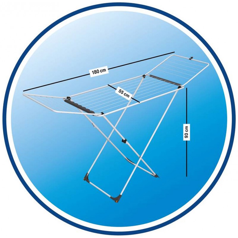 Der Vileda Universal ist der Klassiker unter den Wäscheständern. Der einfache Flügelwäscheständer bietet selbst auf begrenztem Raum Platz für jede Menge Wäsche. Er lässt sich im Keller oder in der Wohnung genauso gut aufstellen wie auf dem Balkon oder der Terrasse. Möchten Sie Ihre Wäsche im Garten trocknen, ist eine Wäschespinne sinnvoll. Sind die beiden Flügel ausgeklappt, ist der Vileda Universal knapp 2 Meter lang und ungefähr 55 Zentimeter breit. Auf 18 Metern Trockenlänge können Sie Socken, Hosen und T-Shirts trocknen – insgesamt etwa zwei Waschmaschinenladungen.